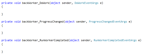The BackgroundWorker has 3 major events:. With this purpose we, first of all, add to the UC_0 the events (for. It is triggered when the BackgroundWorker executes the ReportProgress 'method with a percentage value as the parameter.